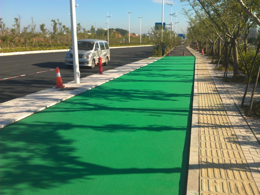 彩色防滑路面的優點:防滑性能高,路面散水性好,色彩鮮艷;施工快速容易,鋪設效率高。特別配制的粘合劑固化快:速固化保證了持續施工,重新開放公路所需的時間大大減少;減少工作場地面積:比其他解決方案可省一半費用;降低噪音:用骨料做成的精細結構有傳導音頻的效果,在水泥路面上使用可以將噪音降低;減少剎車距離:優良的防滑性能減少40%的剎車陸離,此外重型卡車在轉彎處剎車不會產生抱死現象;最小的厚度:設計厚度為3-5mm,無須調整街道設施,也不影響排水;色彩鮮艷、可根據客戶要求提供顏色;用于交通減速帶時有很好的視覺和聽覺效果。